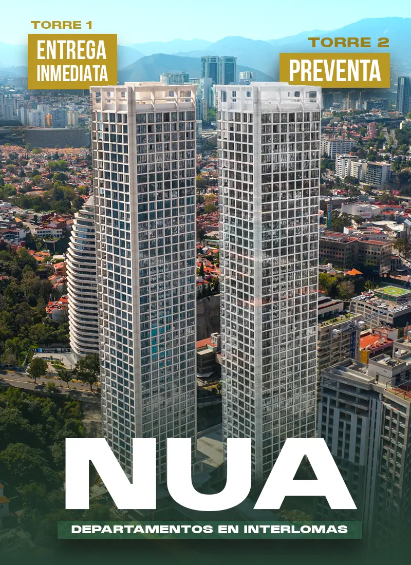 NUA, son departamentos en Interlomas. Una obra de autor del multi-galardonado Arquitecto Jean Michel Colonnier, así comolas dos Torres simétricas más altas del país y el único proyecto residencial en conjugar lofts de 56 m2 hasta departamentos de 173 m2, bosque privado, plaza comercial y oficinas frente a la Universidad más exclusiva del país, en la interconexión de Interlomas, Bosques, Tecamachalco y Vistahermosa.